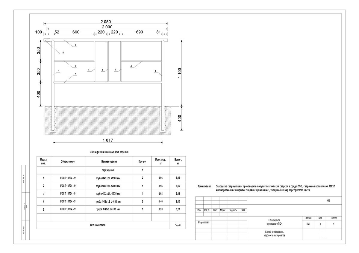 Конструкция состоит из стальных труб различных размеров. Каждый элемент прошёл антикоррозионную обработку. Пешеходные ограждения ПО4 L2000 отвечают требованиям российского ГОСТа 33127-2014. Поставляются в полной комплектации с сертификатами качества и гарантией производителя. Могут использоваться для зонирования территорий, предупреждения перехода дороги в неположенном месте.